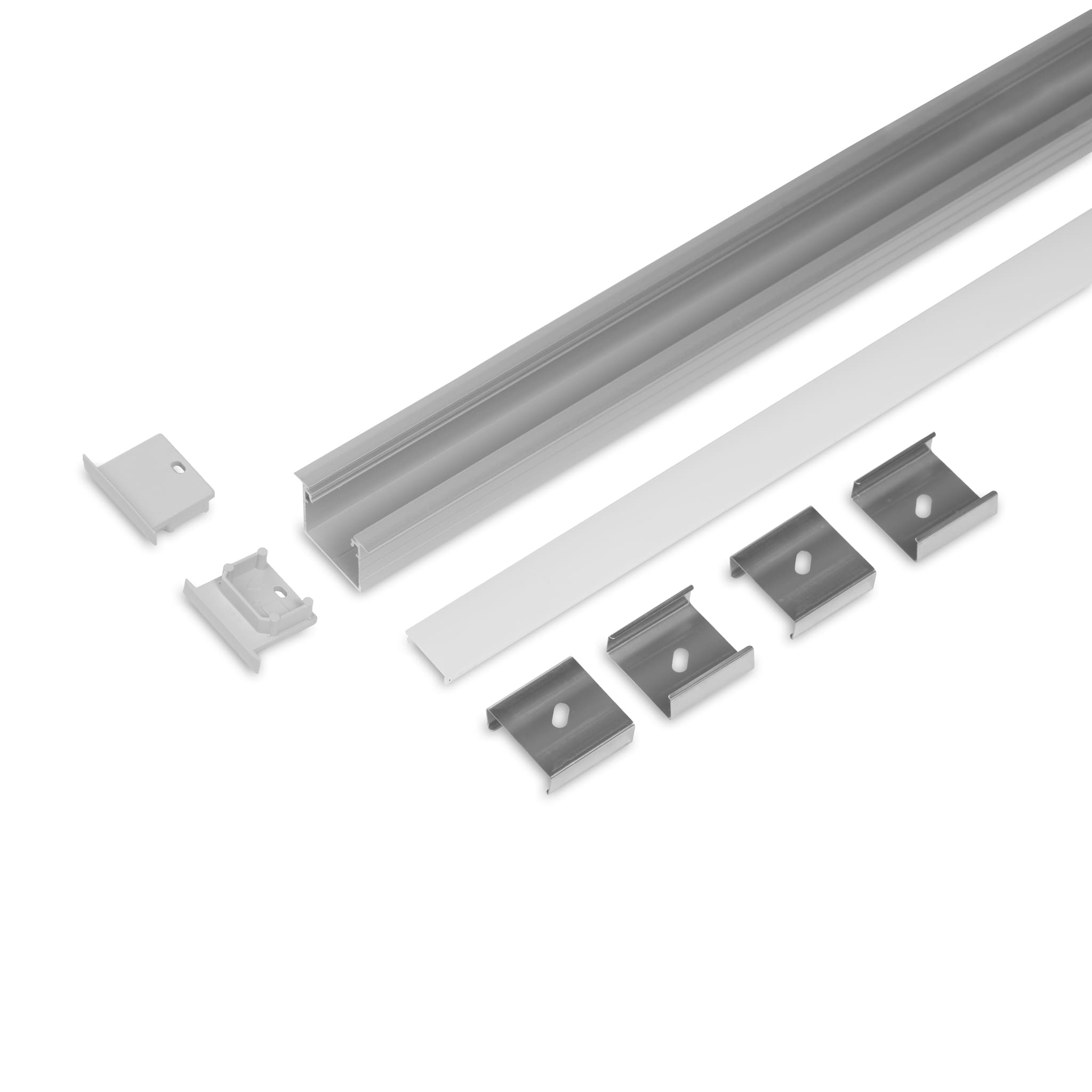 Sættet indeholder: 2m Profil, Diffuser (milky), Endestykker og Monteringsclips