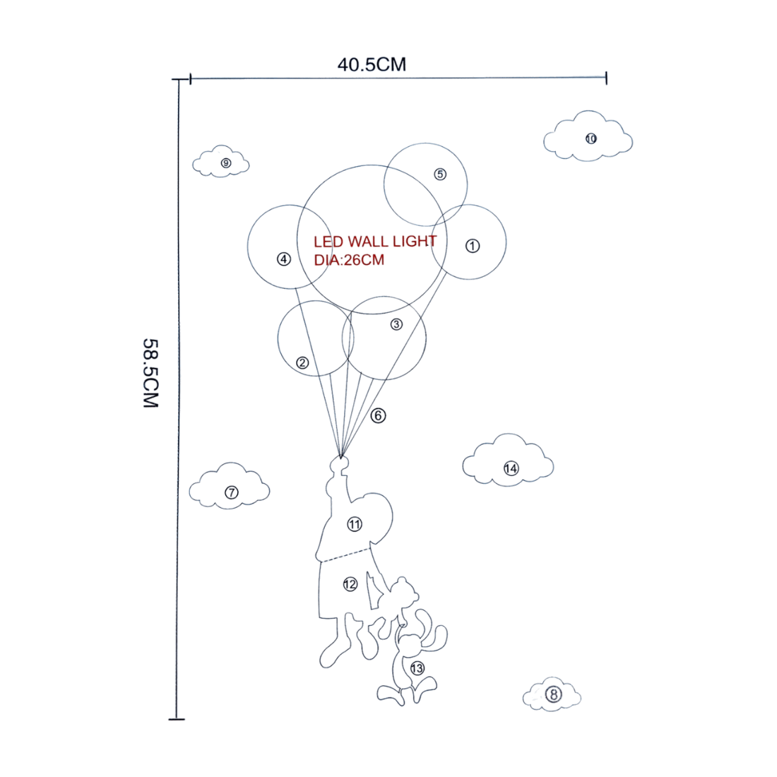 Skab et magisk børneværelse med denne børnelampe, der fungerer som vægpynt. Med wallstickers og balloner, der dækker et område på 40,5cm i bredden og 58,5cm i højden, tilbyder denne væglampe et unikt design, der gør værelset mere indbydende og sjovt.