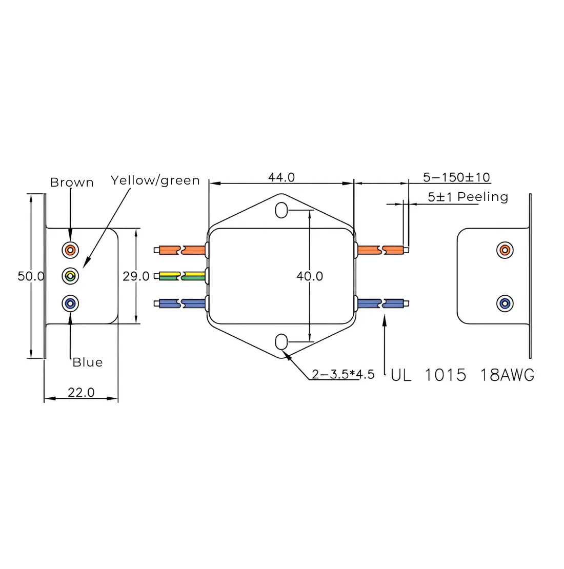 EMI-filteret tilsluttes nemt via ledninger: fase (L) til brun, nul (N) til blå og jord til gul/grøn. Det anbefales at få en autoriseret elektriker til at udføre monteringen for at sikre korrekt installation og optimal funktion. Bemærk, at jordforbindelsen er afgørende for filterets effektivitet.Ideelt til solcelle- og maskinsystemer