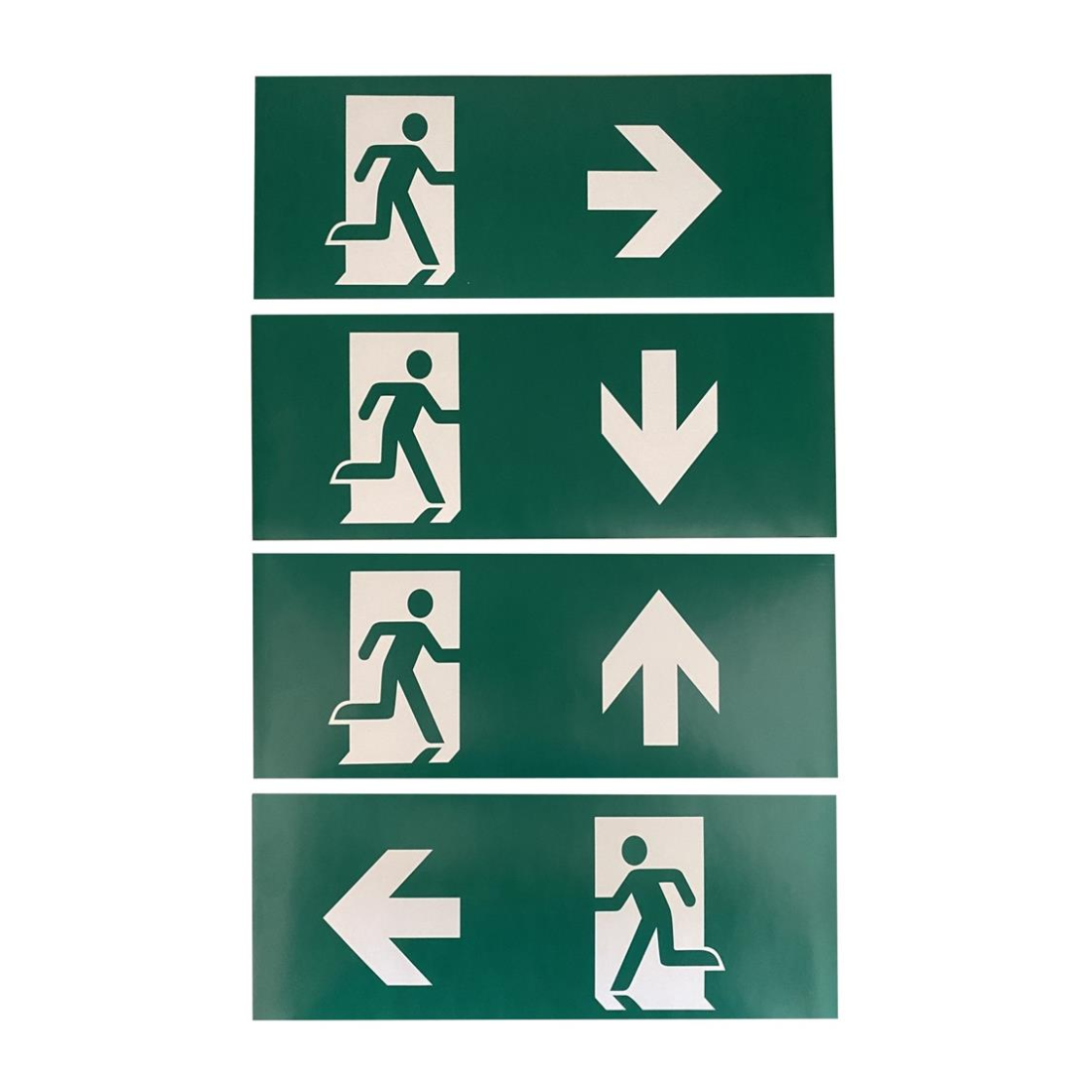 Flugtvejsskiltet er designet til at sikre optimal synlighed, selv i mørke eller røgfyldte omgivelser. De medfølgende piktogrammer viser en løbende figur, der kan pege både til højre og venstre, hvilket gør det nemt at guide folk til den nærmeste nødudgang.
