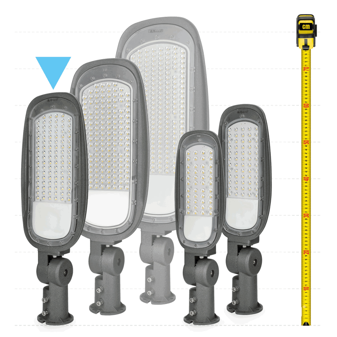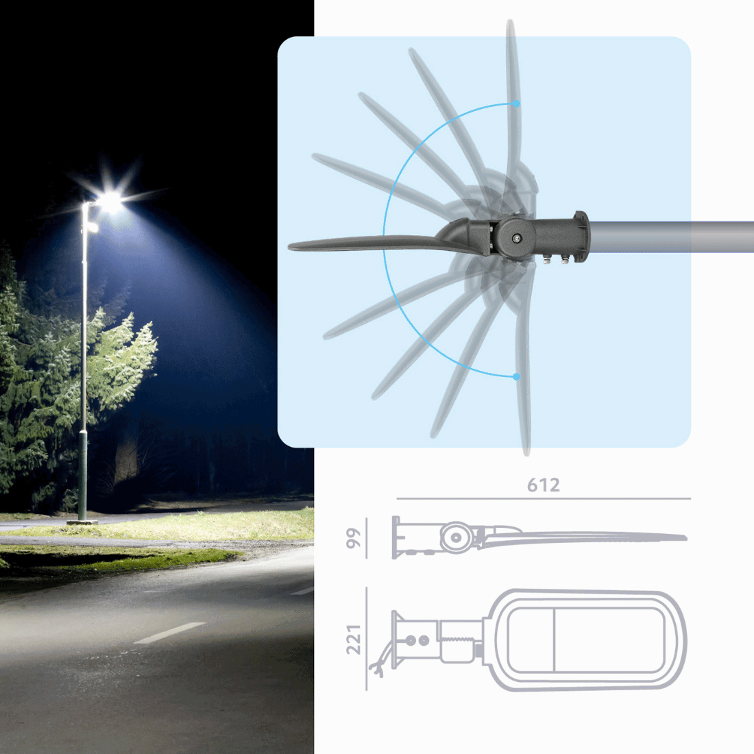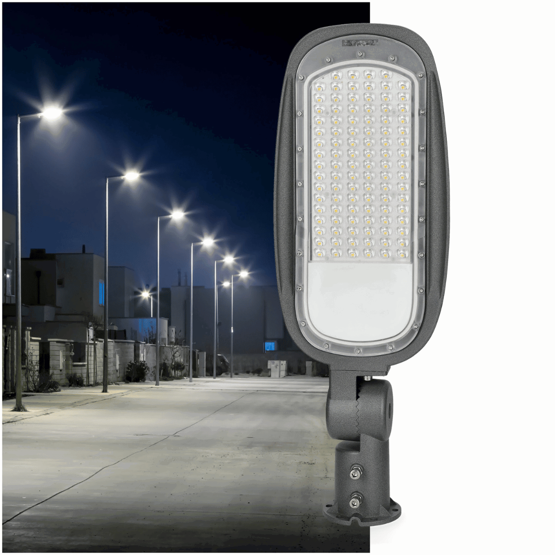 Denne LED lampe er perfekt til udendørs belysning af store områder som parkeringspladser, gårde og gader. Lampen har en effekt på 100W og en lysstyrke på 14.000 lm ved en farvetemperatur på 4000K. Den kan justeres med op til 180 grader og er støvtæt og vandafvisende takket være dens høje IP66 klassificering. Lampen har en krop af aluminium og et cover af plastik, kan installeres både vertikalt og horisontalt og passer til pilare med en diameter på 60 mm.
