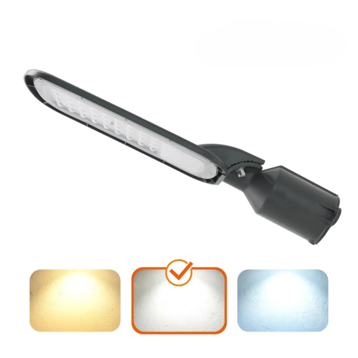 LED BRELUXO 200W er en driftssikker gadelampe til veje, parkeringspladser, cykelstier og byrum. Den asymmetriske 130×75° lysfordeling giver jævn belysning og mindre spildlys, så trafikanter og fodgængere ser tydeligt uden blænding. Med 20.000 lm og 4000K neutralhvidt lys får du klart, behageligt lys, der gør skilte og afmærkning nemme at læse. Huset er i robust aluminium med polycarbonat-diffusor, slagfasthed IK08 og farvegengivelse Ra ≥85. Armaturet kan monteres på væg eller Ø60 mm mast, lodret eller vandret, og passer pænt ind i moderne bymiljøer takket være den grå farve.