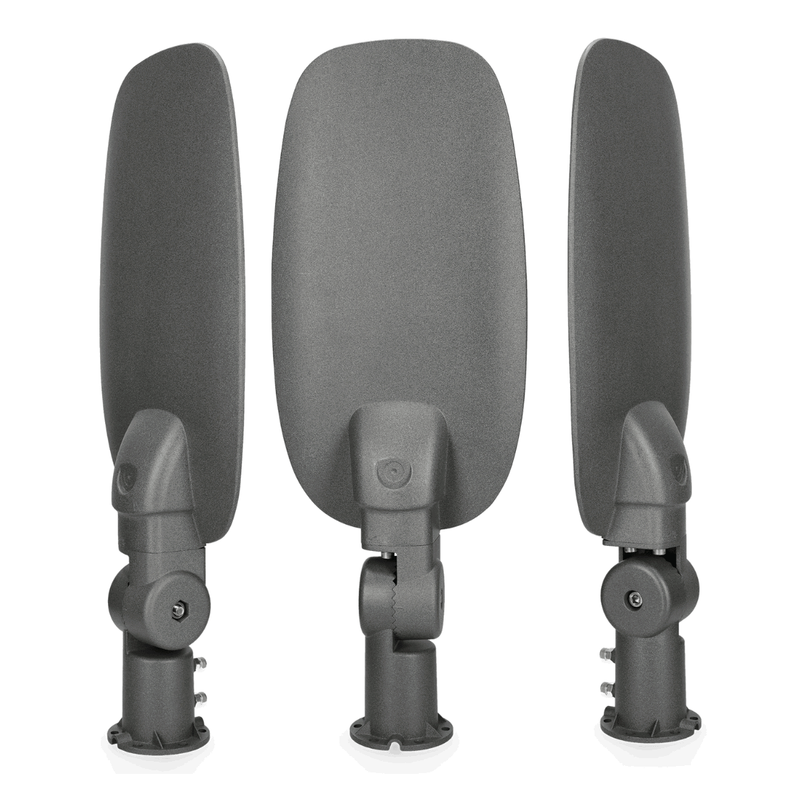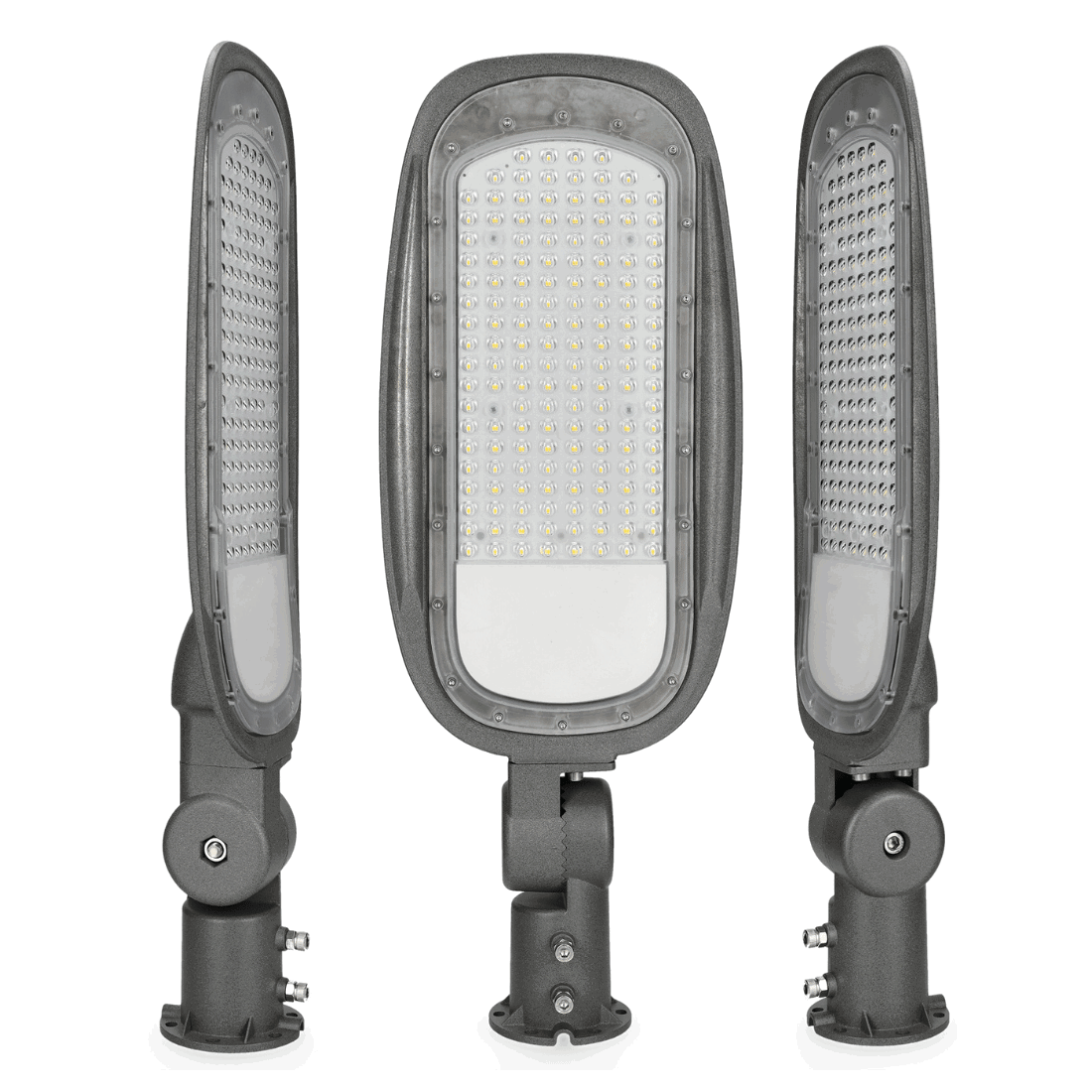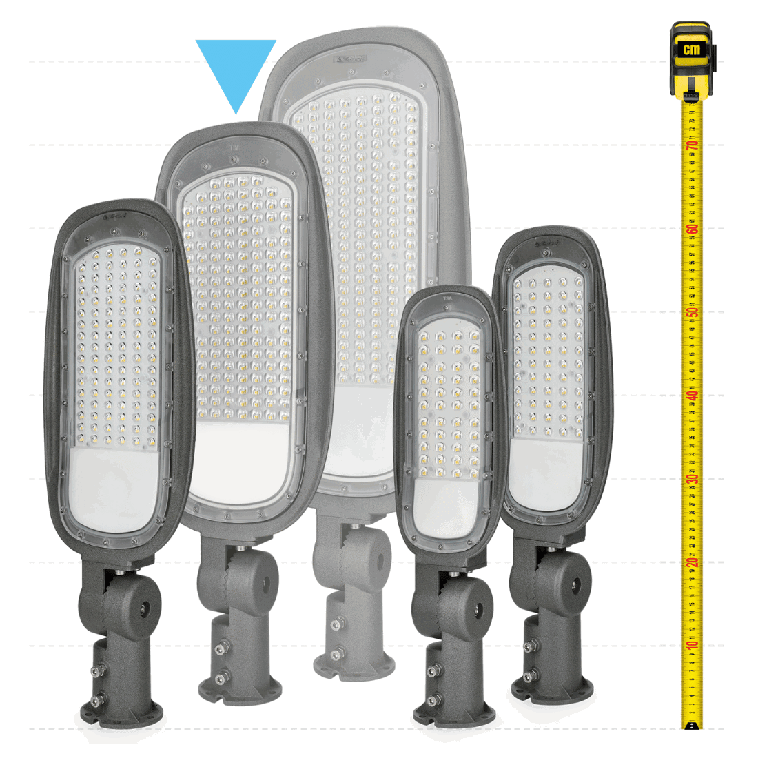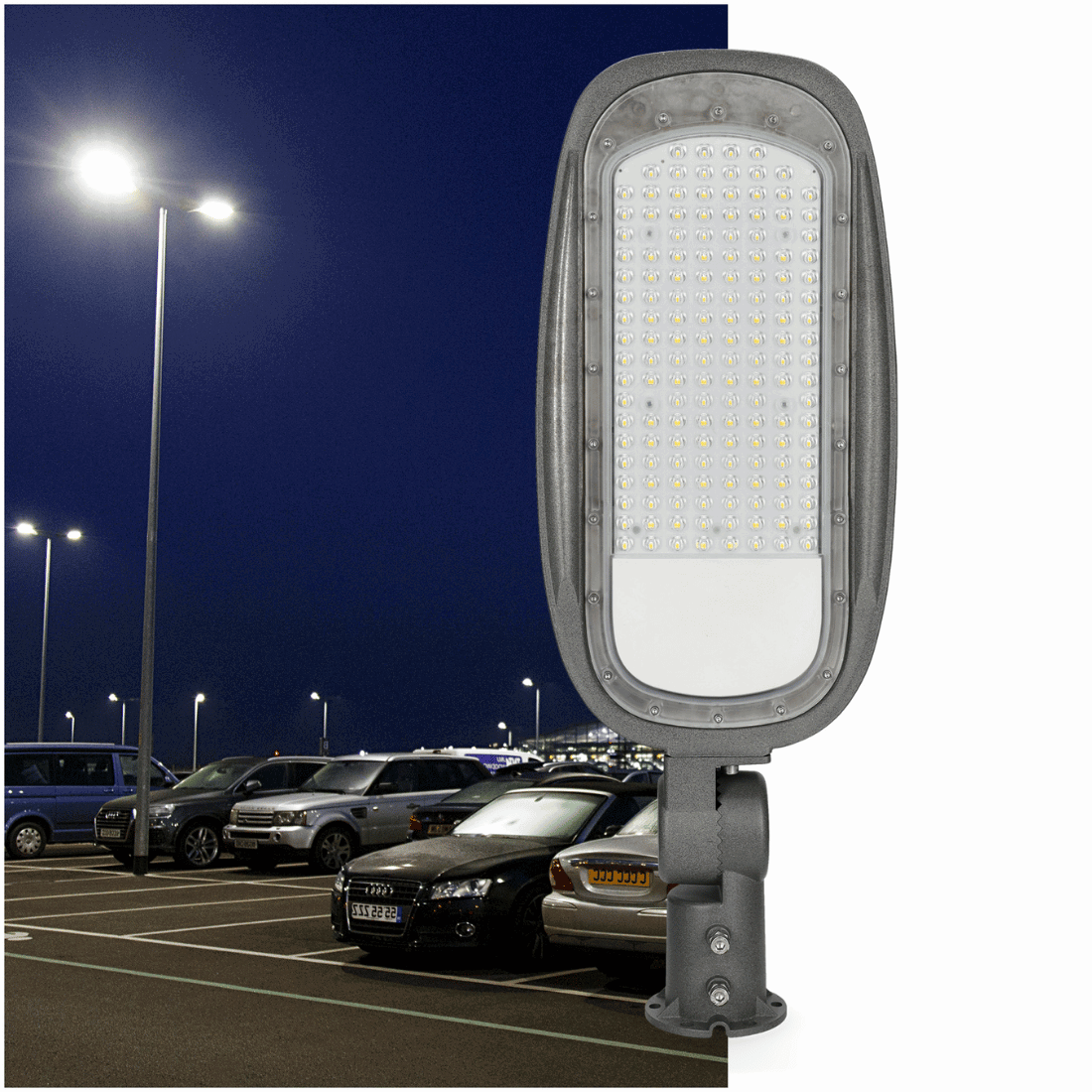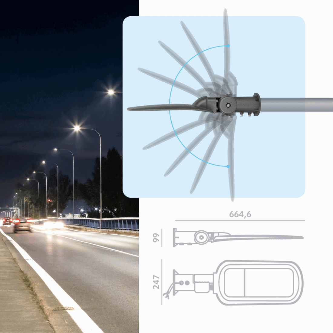 Denne LED lampe er perfekt til udendørs belysning af store områder som parkeringspladser, gårde og gader. Lampen har en effekt på 150W og en lysstyrke på 20250 lm ved en farvetemperatur på 4000K. Den kan justeres med op til 180 grader og er støvtæt og vandafvisende takket være dens høje IP66 klassificering. Lampen har en krop af aluminium og et cover af plastik, kan installeres både vertikalt og horisontalt og passer til pilare med en diameter på 60 mm.
