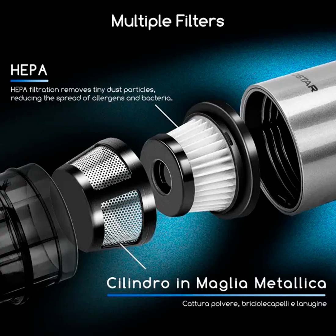 Du behøver ikke bekymre dig om konstant opladning, vores støvsuger har imponerende udholdenhed, så du kan tage fat på daglige små rengøringsopgaver uden besvær. Desuden sikrer dens støvtætte design, at når snavset først er væk, forbliver det væk.Vaskbart HEPA filter