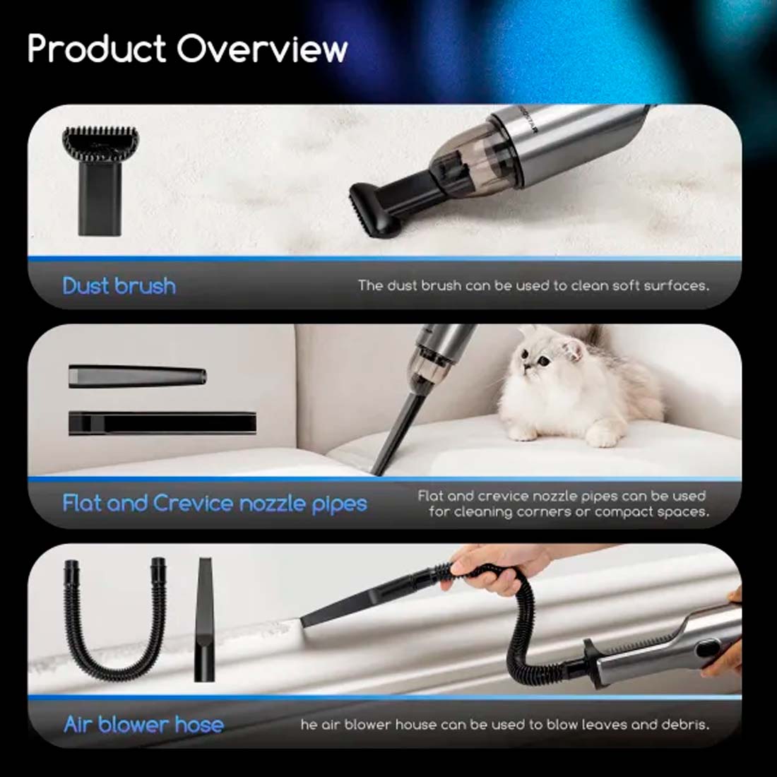 Med den trådløse håndstøvsuger opnås der en problemfri og effektiv støvsugning. Støvsugeren er skabt med fokus på letvægt, kompakt design og en imponerende suge kraft, hvilket gør den ideel til brug i en række forskellige miljøer, lige fra biler og hjemmet til kontoret og andre steder. Det er nemt at holde den opladet, uanset hvor du befinder dig, takket være dens alsidige Type-C opladningsport.