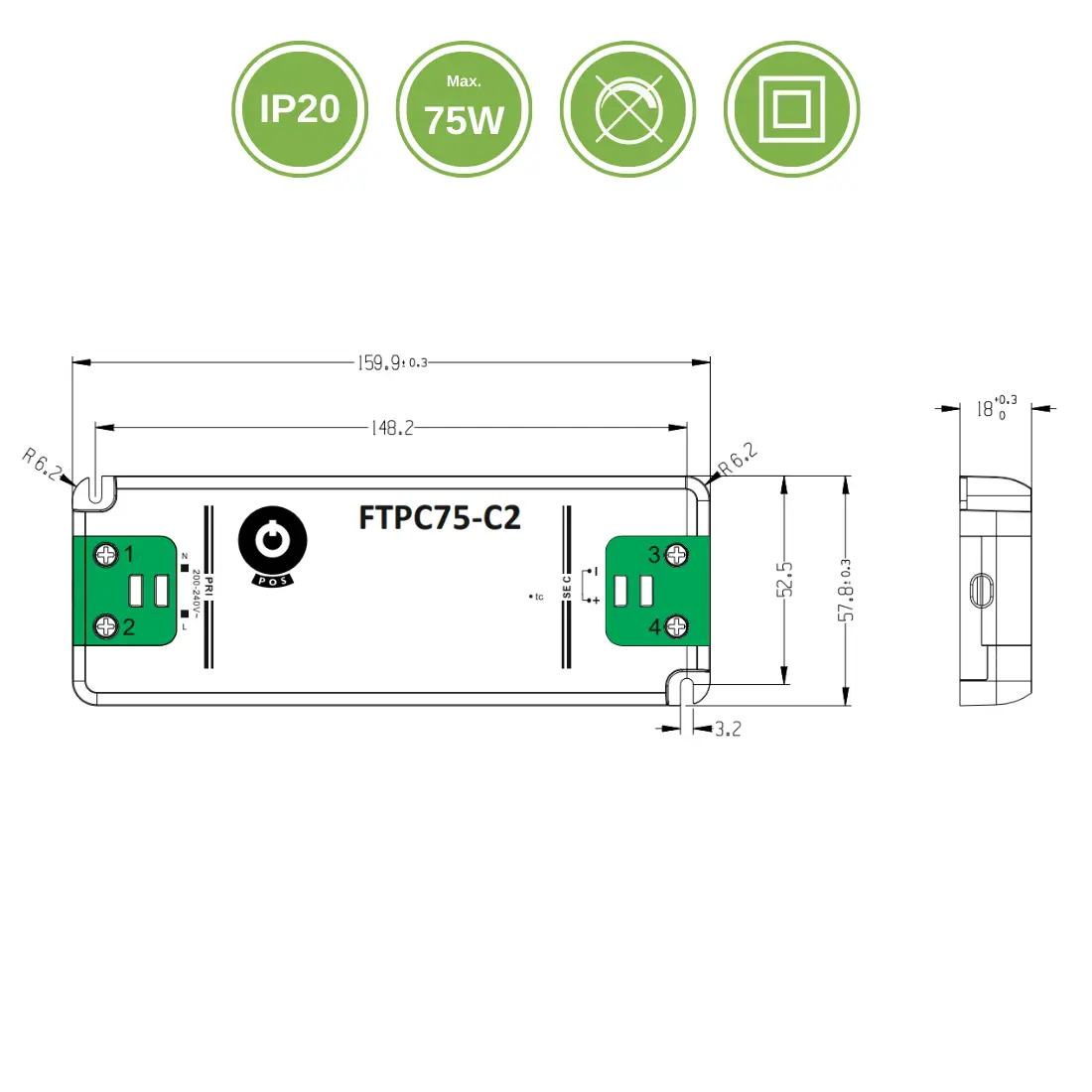 Specifikationer for: "LED Driver 24V / Transformer | 0 - 75W | 3,13A"
