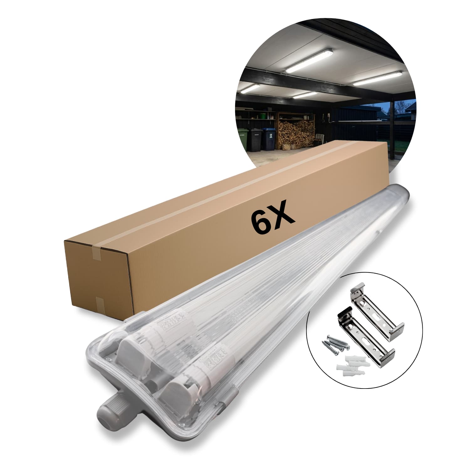 Pakke med 6 stk. udendørs LED Rør Armaturer - 150cm - Inklusiv 2 stk. 22w LED Rør - 7040lm - 160lm/W - 4000K - Stænktæt - IP65