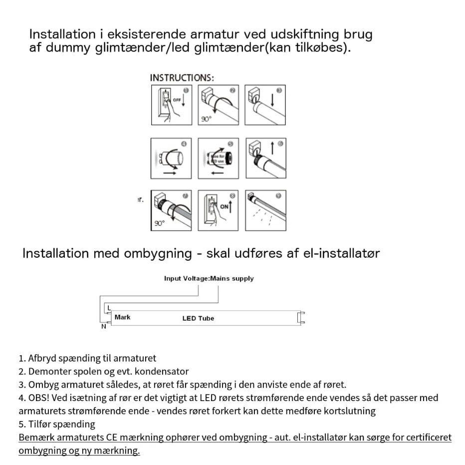 OBS! Ved installation i LED armatur eller ombygget armatur skal LED rørets strømførende ende vendes så det passer med armaturets strømførende ende - vendes røret forkert kan dette medføre kortslutning