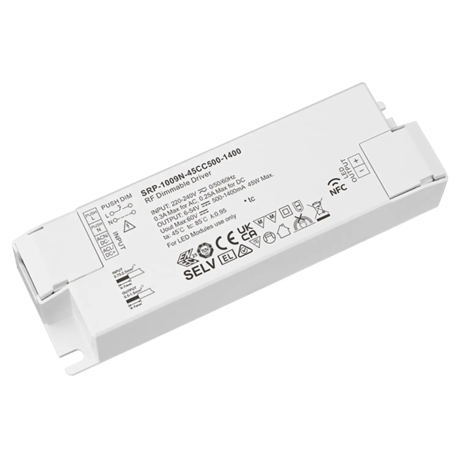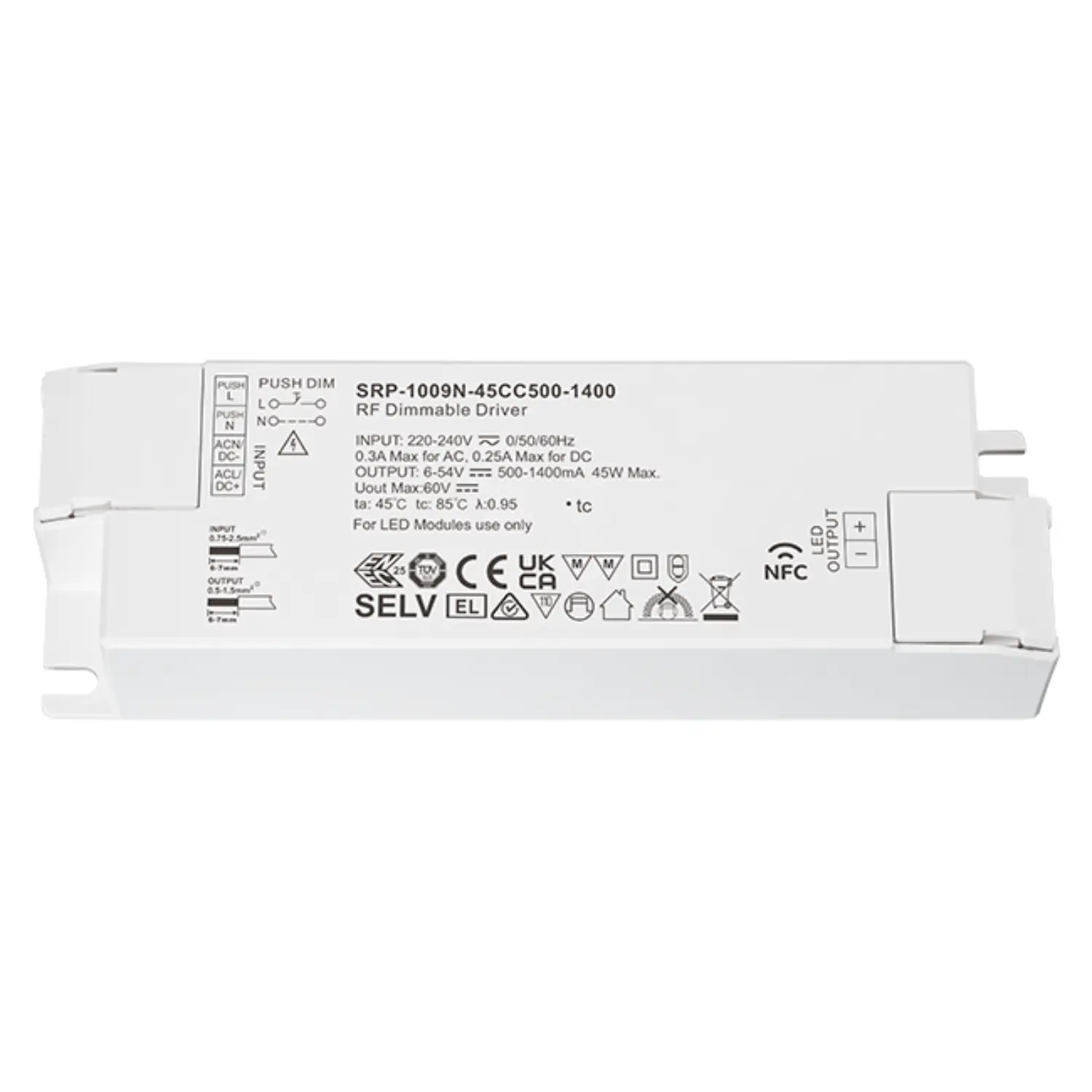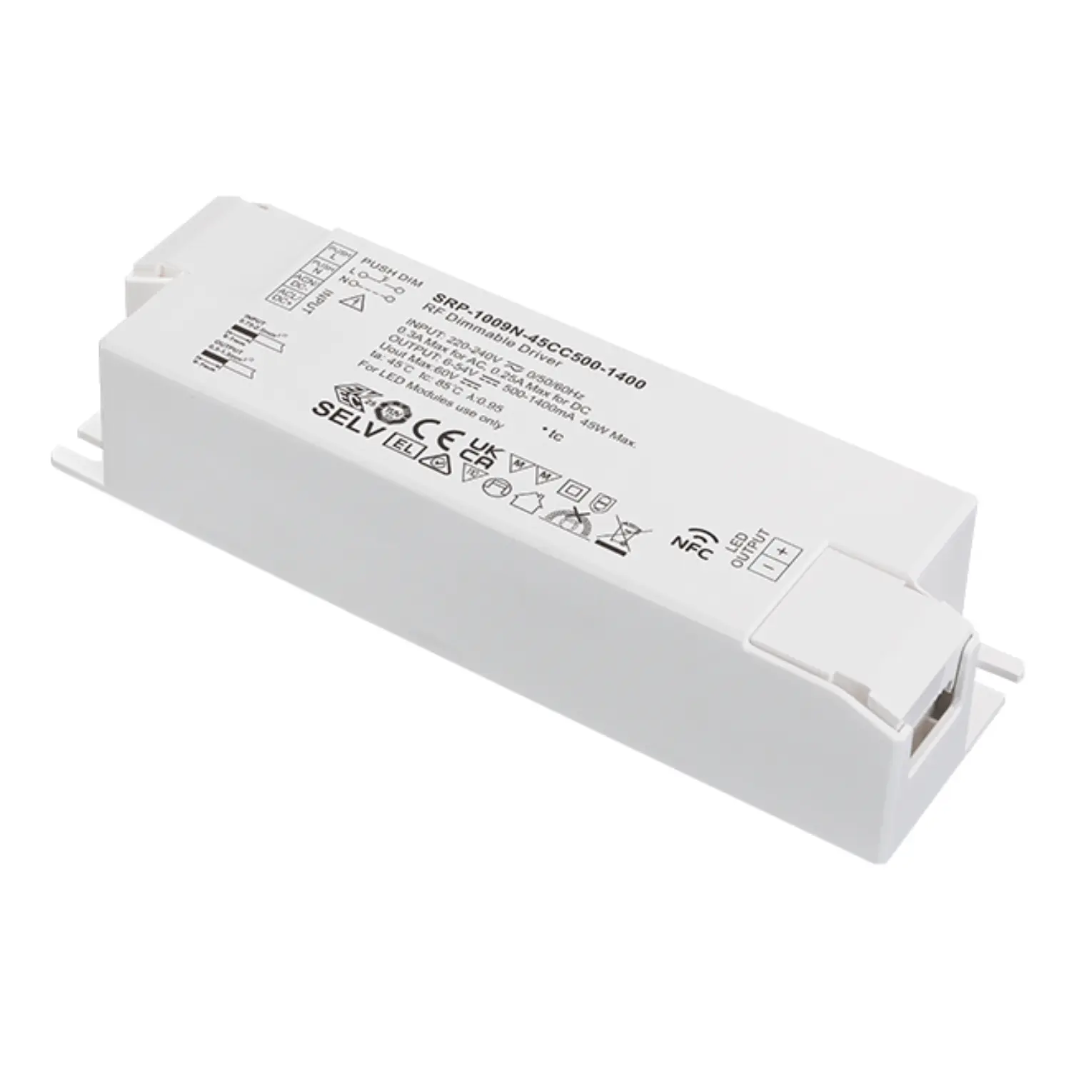 Denne NFC LED driver kan programmeres via en "SR NFC TOOL" app, så strøm, dæmpningskurver og opstartsadfærd kan justeres uden at åbne driveren. RF styring gør det let at integrere driveren i mere avancerede styringsløsninger. RF LED driver teknologien understøtter flere frekvenser, herunder 868 og 434 mhz, hvilket giver fleksibilitet i forhold til installationer og systemer.