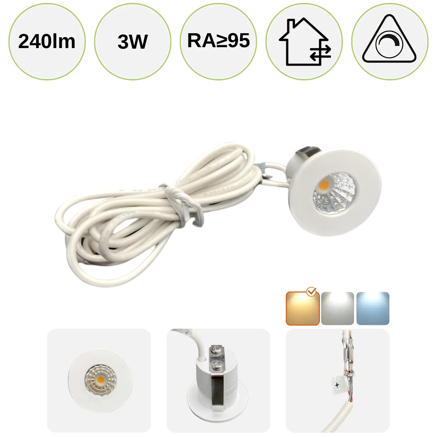 Du får her 6 stk. flotte og super enkle mini spots, som er perfekt til badeværelset, møbler, vægge eller loftet. Spotsene har et lavt forbrug på kun 3W og yder hele 240lm pr. Desuden har spotsene en farvetemperatur på 2800K, også kaldet varm hvid. I denne pakke får du hele 6 stk. spots inklusiv dæmpbar driver og fordeler.