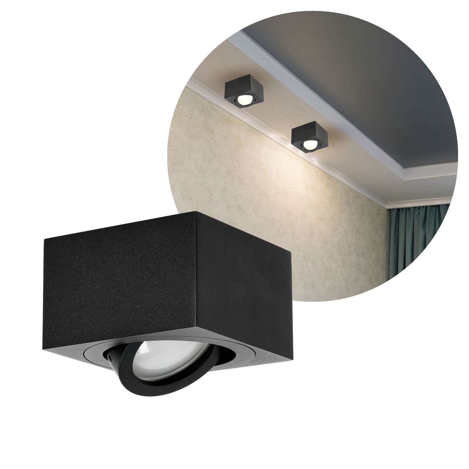 Dette sorte firkantede påbygningsspot, er en stilren og fleksibel løsning til rum, hvor indbygningsspots ikke passer. Fremstillet i aluminium, med kipbar funktion, giver dette spot både stil og funktionalitet. Ideelt til moderne indretninger, hvor der ønskes en enkel installation og præcist lys.