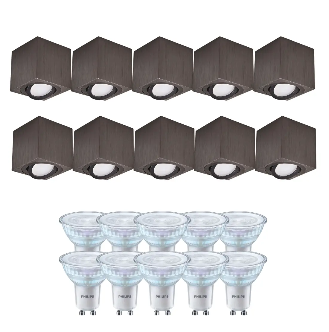Denne pakke indeholder 10 stk. sorte firkantede påbygningsspots og dæmpbare Gu10 3000K lyskilder. Du kan med dette spot kippe fronten med op til 15°, så du kan retningsbestemme lyset. Spottet i denne pakke er perfekt til de steder, hvor du ikke har plads over loftet til at montere indbygningsspots. Inkluderet i pakken sammen med påbygningsspottet er også 10 stk. dæmpbare Philips Master LED Gu10 pærer som yder 365lm med et forbrug på 3,7W.