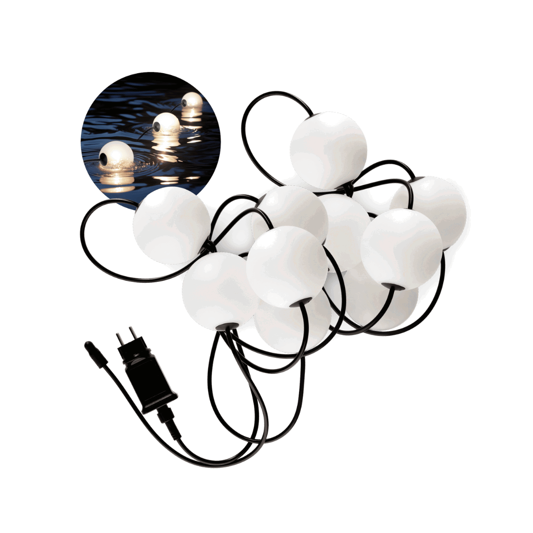 Denne udendørs lyskæde på 7,74 meter med 10 lyskugler er perfekt til både have og vandmiljøer som en sø eller pool. Hver lyskugle anvender 0,8W (8W i alt) og producerer 70 lumen (700lm i alt), hvilket gør den energibesparende. Lyskæden har IP67 beskyttelse, hvilket gør den støv- og vandtæt. Med en varm hvid belysning på 3000K og en bred strålevinkel på 280 grader, skaber den en hyggelig atmosfære. Lyskæden er nem at montere og ideel til helårsbrug.